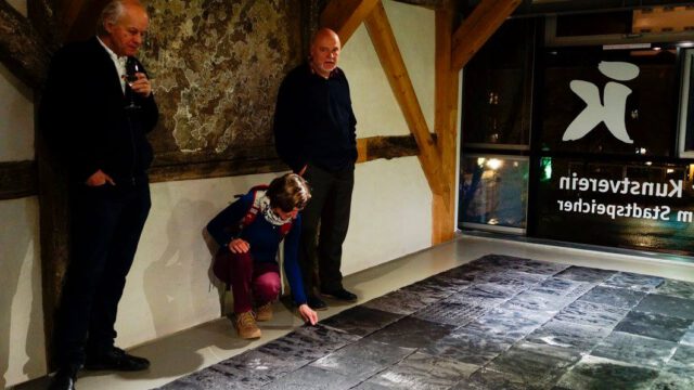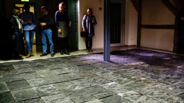 Die Bodenarbeit „Ruhe vor dem Sturm“ bewegt sich zwischen Malerei, Grafik und Installation und ist explizit für die Ausstellung in Jena entstanden. Auf 160 Bögen Aquarellpapier hat Nicola Grabiele an verschiedenen Orten – auch in Jena – Abdrücke von Erdoberflächen genommen. Rauhe Erde ist der Ausgangspunkt der abgebildeten Strukturen. Sie bleibt lesbar und präsent. Jede Region bildet Ihre eigene Charakteristik aus. Auf dem Boden ausgelegt lassen die Blätter in ihrer Gesamtheit ein großes Bild entstehen.
